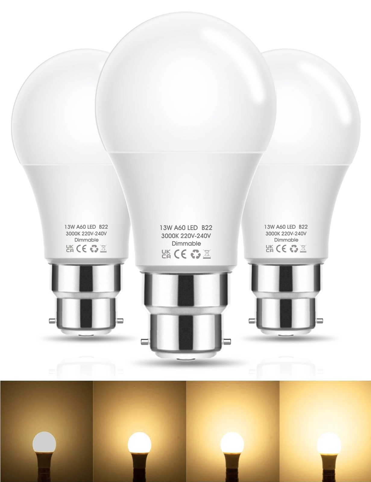Dimmable Bayonet Light Bulbs 100W, 13W LED Bulbs Bayonet Warm White 3000K, 1200L
