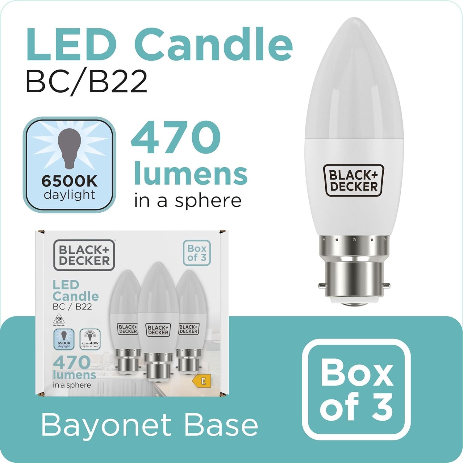 Black+Decker B22 LED Candle Light Bulbs Bayonet 4.2w Daylight 6500K Pack Of 3