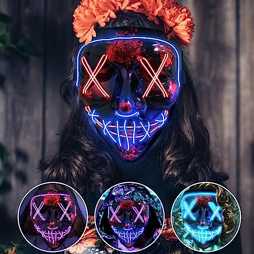 Halloween Mask, LED Light Up Mask with 3 Light Modes, Glow LED Face Mask for Halloween Festival Cosplay Halloween Costume Party Decorations (Red+Blue)