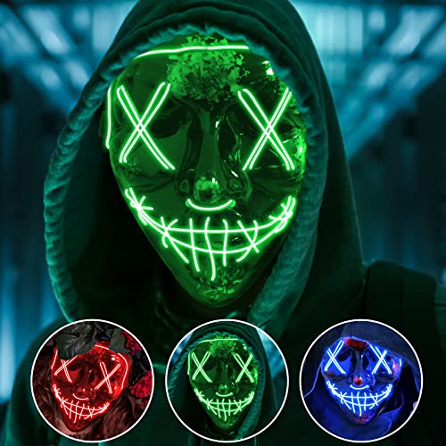 Halloween Mask, LED Light Up Mask with 3 Light Modes, Glow LED Face Mask for Halloween Festival Cosplay Halloween Costume Party Decorations (Purple+Green)