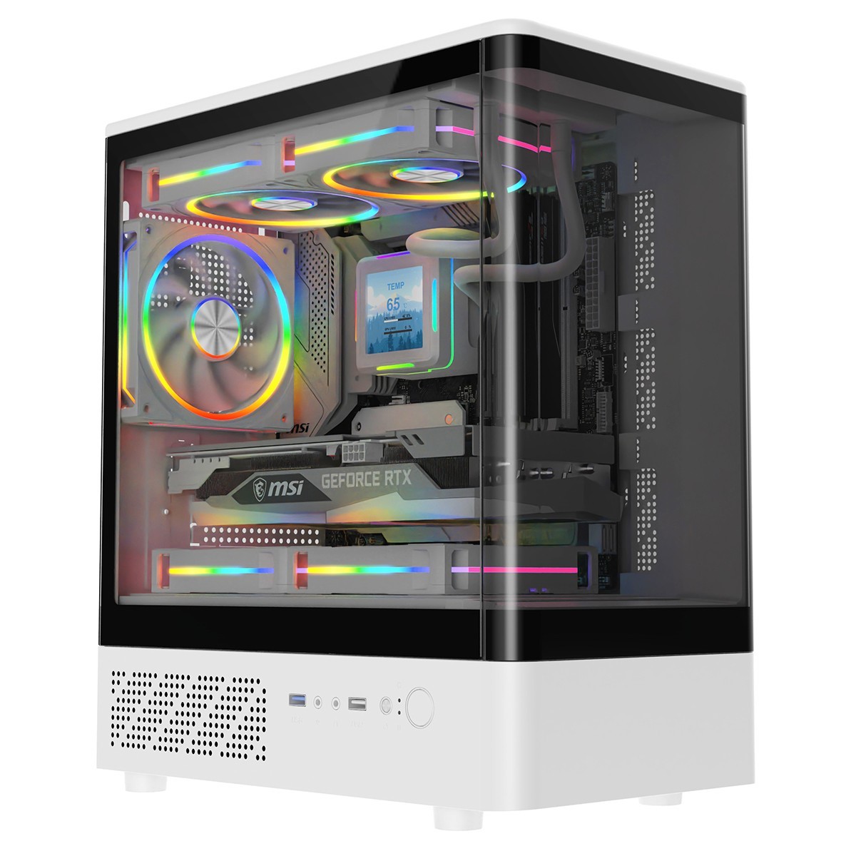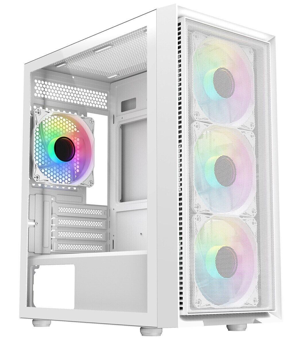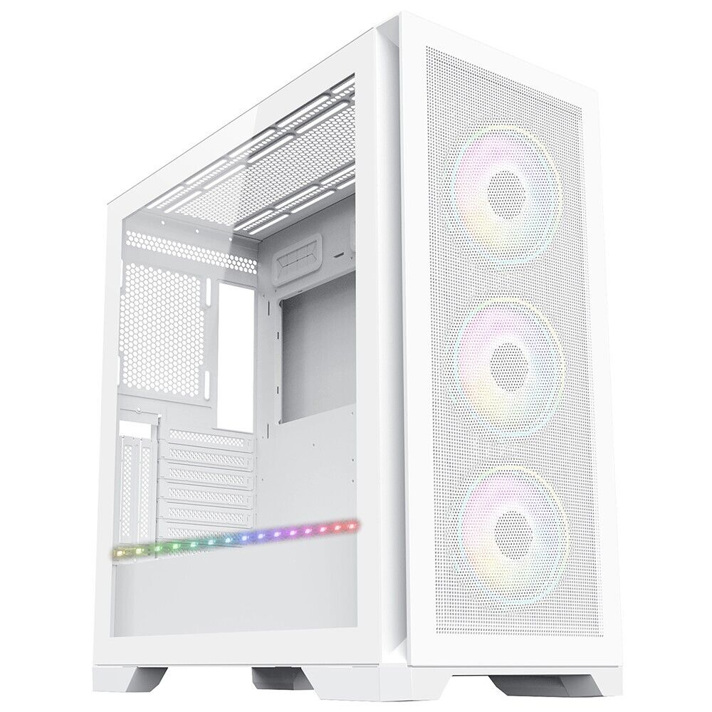 Gaming PC Case White Mid Tower Full View Tempered Glass Panels 3x ARGB LED Fans