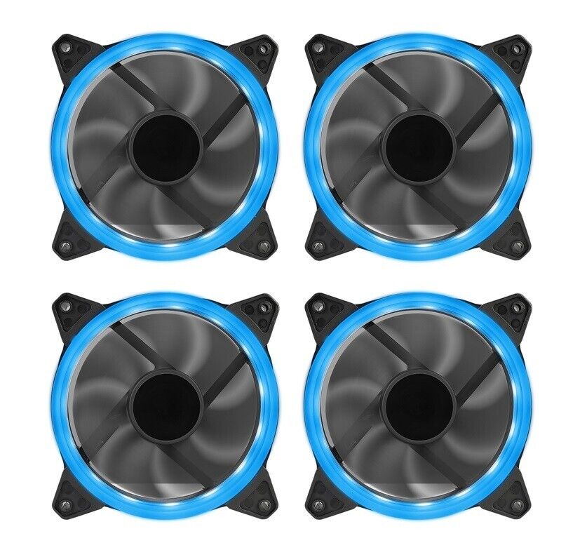 120mm 12cm Blue Ring LED Quiet 3 Pin + 4 Pin PC Case Fans 48CFM 20dBA - 4 Pack