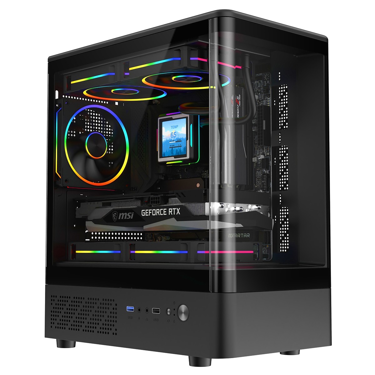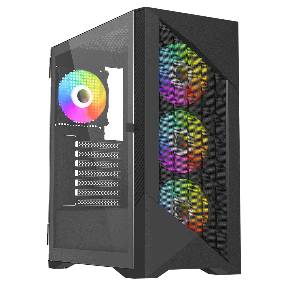 Gaming PC Case Black Mid Tower Full View Tempered Glass Panels 3x ARGB LED Fans