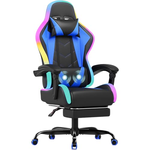 JUMMICO LED Gaming Chair with Massage Lumbar Support & Footrest, Ergonomic Reclining Gamer Chair for Adults, High Back PU Leather PC Chair with RGB Lights, Blue