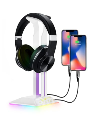 KALAHOL RGB Headphone Stand, Gaming Accessories Headset Stand, 2 USB & 1 Type-C Ports, LED Headset Holder Headphone Accessories for All Headphones, Gift for Birthday, Boys, Christmas PC Gamer (White)