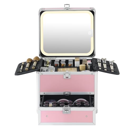 GALHUBIS Makeup Case with Lighted Mirror, Makeup Box Organizer with Detachable LED Mirror, Travel Makeup Train Case, Waterproof Cosmetic Organizer, Standing Brush Holder, Gift, Pink