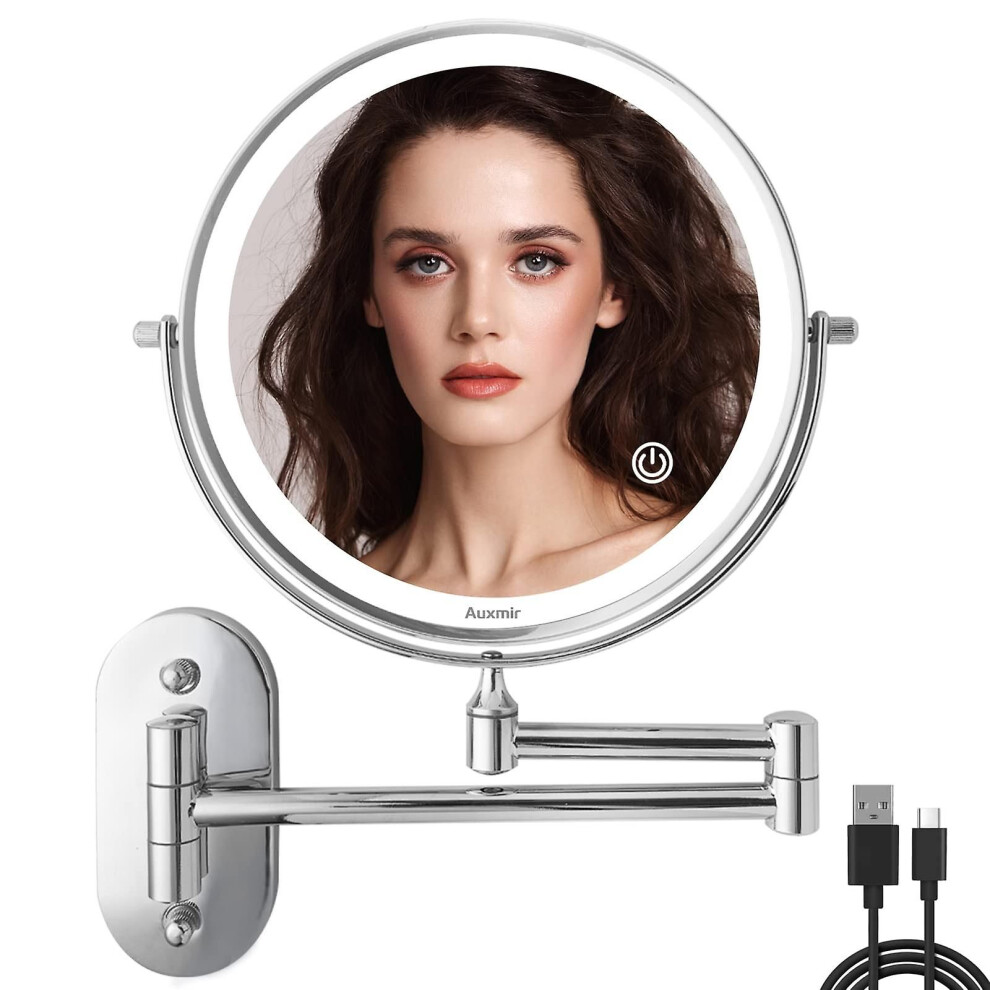 LED Lighted Cosmetic Mirror 1x/10x Magnification Dimmable Touch Switch USB Rechargeable 360 Rotatable Wall Mount Shaving Mirror