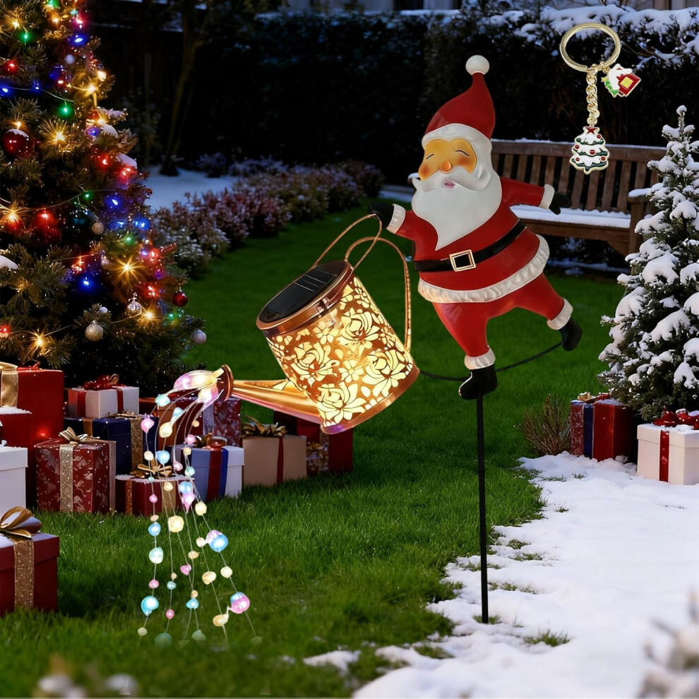 Solar Christmas Kettle Lights with Santa Claus & Watering Can, Outdoor Hanging Metal Garden Decor, LED Lawn/Patio Lights (1PC-A)