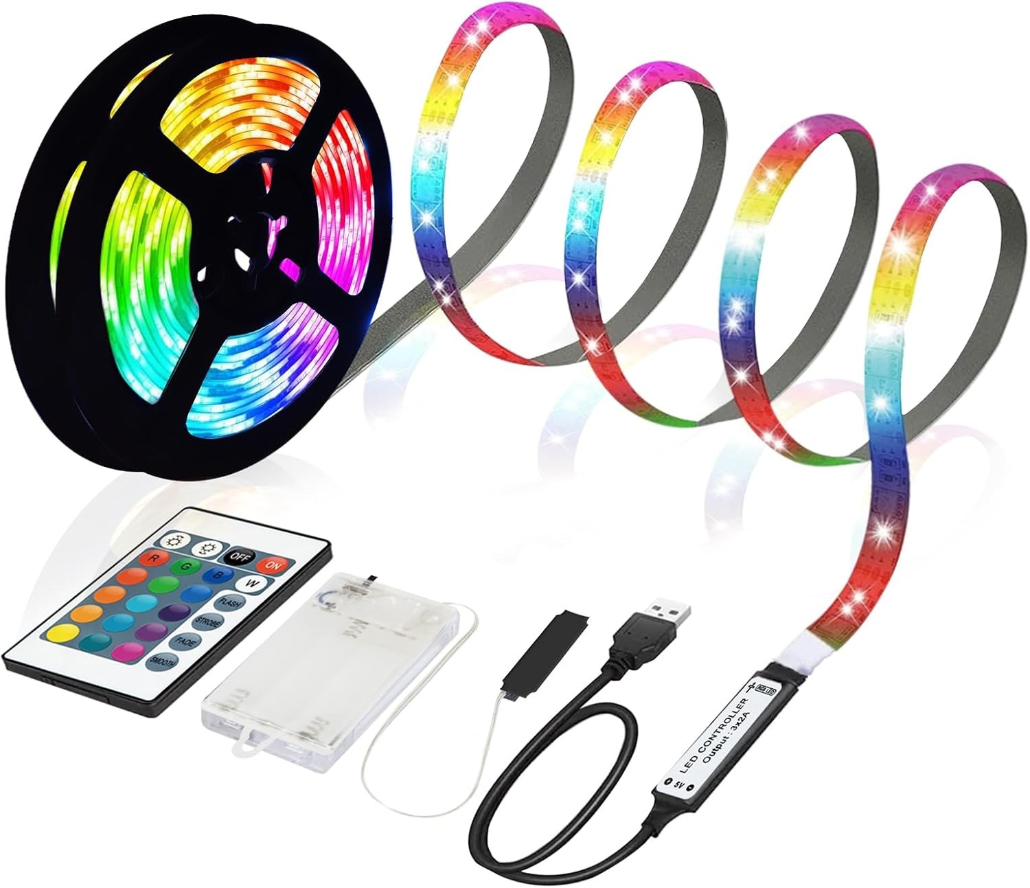 5m RGB 5050 LED Strip Battery Operated or USB, Remote Dimmable 16 Colours, Cutt