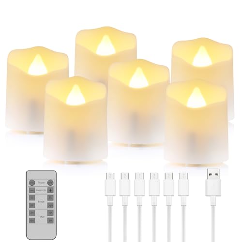 Rechargeable,6pcs Flickering LED Tea Lights Candles with USB Charging Cables, Flameless Votive Candles with Timer & Remote, Warm White Light Electric Fake Candle for Christmas Festival Decor Home