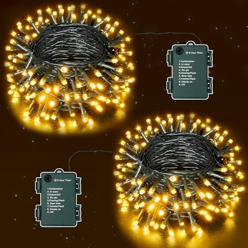 Ollny Fairy Lights Battery Operated, 20M 200 LEDs Battery Powered String Lights, 2 Pack 10m Warm White Outdoor Lights Waterproof with 8 Modes/Timer for Indoor Bedroom Outside Garden Tree