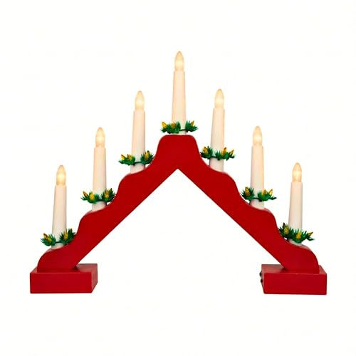 SHATCHI Traditional Wooden Pre-Lit Red Candle Bridge Light 7 LEDs Bulbs - Battery Powered - Window Christmas Tree Home Office Desk Light Holiday Xmas Festive Decoration