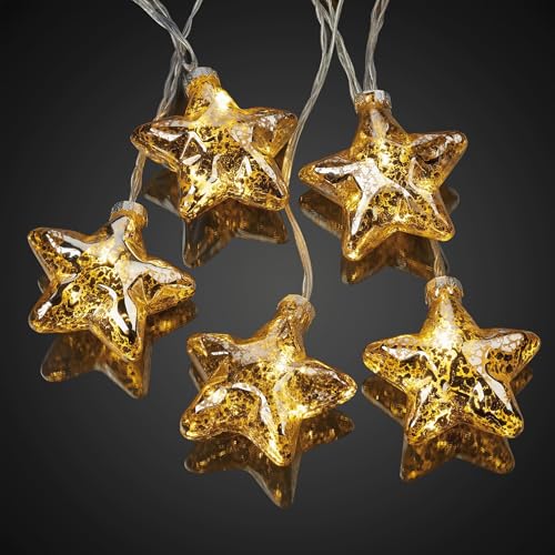 hellum 152739 LED Fairy Lights with Glass Stars Gold Antique Finish 10 LEDs Warm White Battery Operated 3 x AA Indoor Illuminated 1.80 m Cable Transparent Christmas Decoration