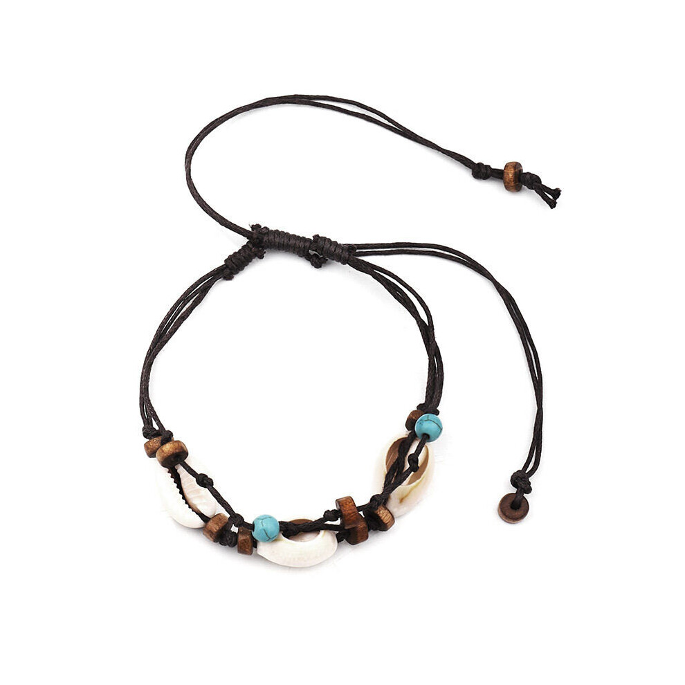 3X Boho Natural Sea Shell Stone Anklets for Women Wood Bead Seashell Ankle Bracelet on Leg Foot Chain Wax Rope Anklet