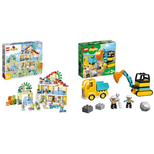 LEGO 10994 DUPLO Town 3in1 Family House, Brick-Built Dolls House with Push&Go Car, 5 Figures & 10931 DUPLO Town Truck & Tracked Excavator Construction Vehicle Toy for Toddlers 2-4 Years Old