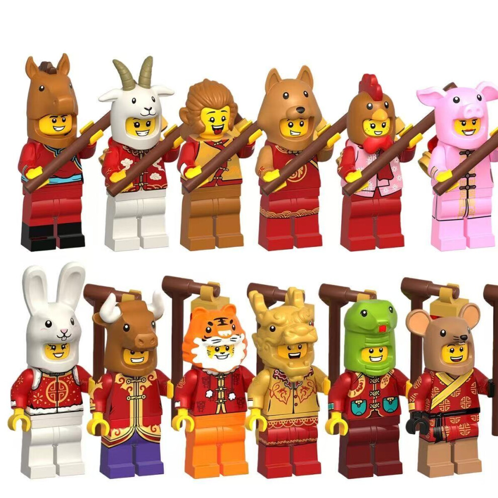 12pcs Chinese zodiac Snake Rabbit Tiger Cow Chicken Monkey Dragon Dog Pig Mouse Building Blocks Anime Minifigures Toy Fits Lego