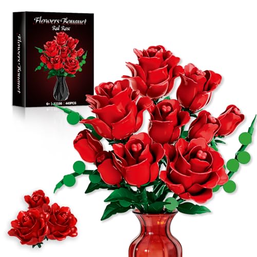 Red Rose Bouquet Building Blocks Set - Lego Compatible 12Pcs Flowers Botanical Collection Kit with Mixed Roses & Leaves,Valentines Gifts for Adults Women Mom Wife Couple Home Decor (No Vase)