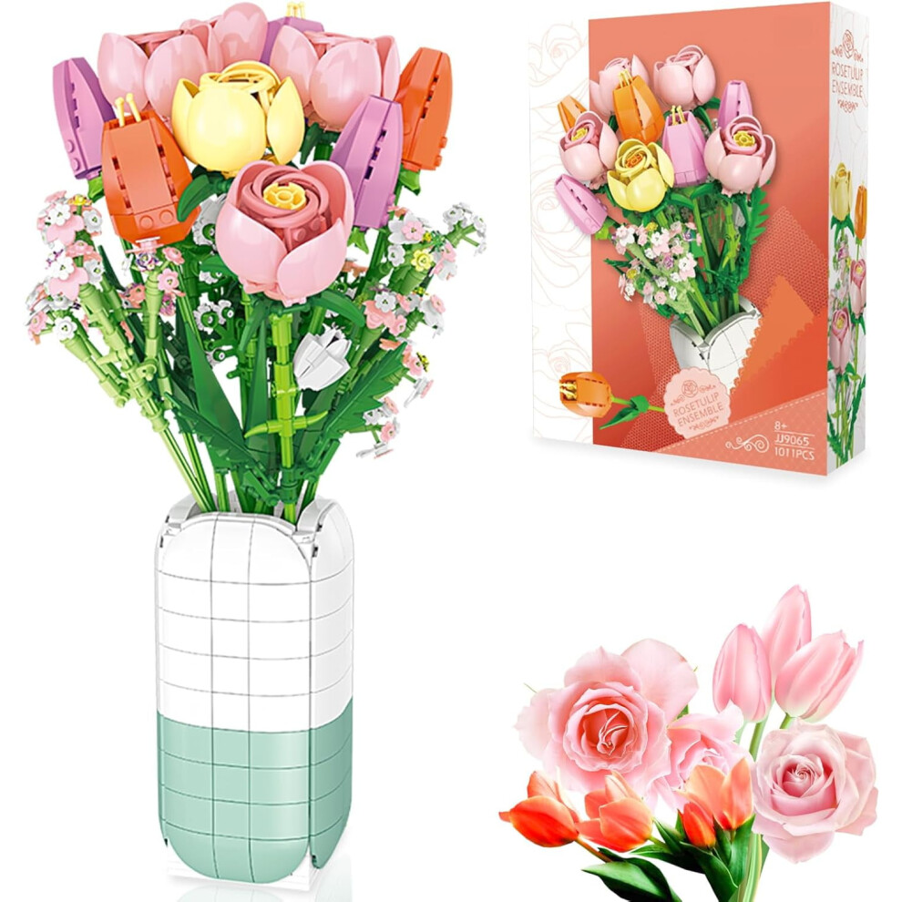 Flowers Bouquet Building Sets Rose Tulips with Vase for Adults Girls Compatible with Lego