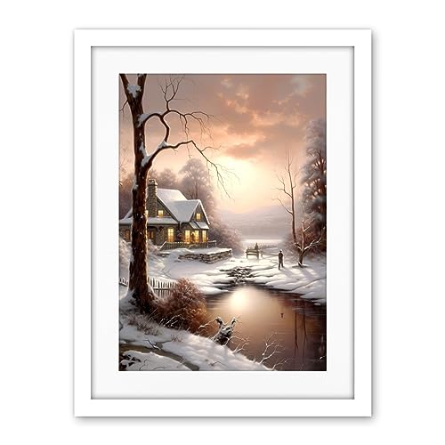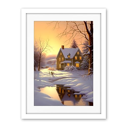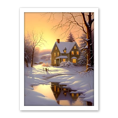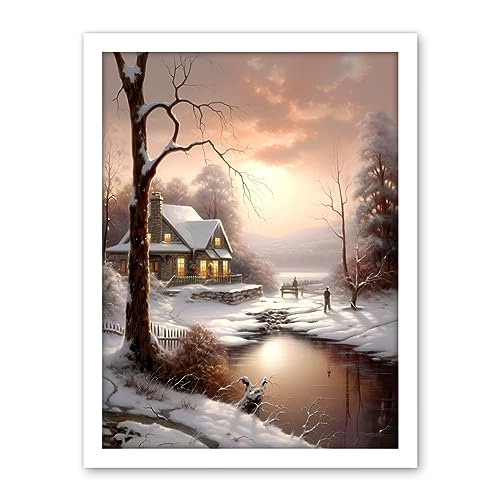 Artery8 Winter Cottage Landscape Oil Painting Snow Lake Sunset Snowy Trees Artwork Framed Wall Art Print 18X24 Inch