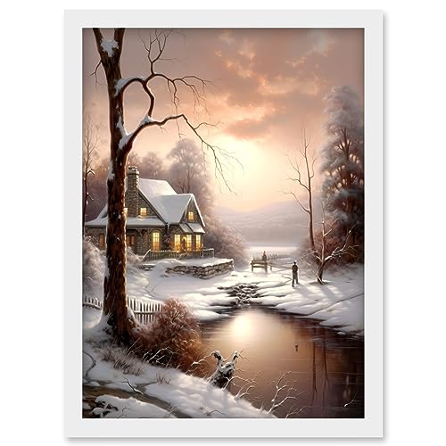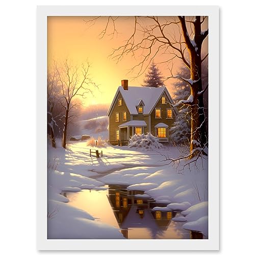 Artery8 Winter Cottage Landscape Oil Painting Snow Lake Sunset Snowy Trees Artwork Framed Wall Art Print A4