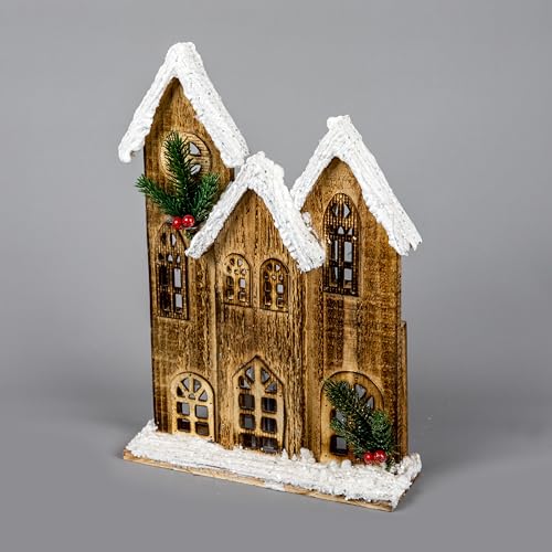 SHATCHI 35cm Battery Powered Warm White LEDs Wooden House Snow Covered Cottage Village Indoor Christmas Decorations, Wood, Brown