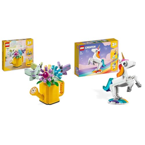 LEGO Creator 3in1 Flowers in Watering Can Toy to Welly Boot to 2 Birds on a Perch & Creator 3 in 1 Magical Unicorn Toy to Seahorse to Peacock, Rainbow Animal Figures