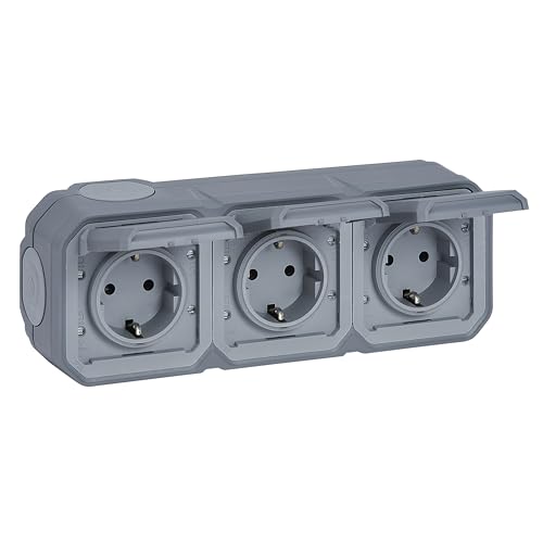 LEGRAND, Plexo 069743L Wet Room Socket, 3-Way, Schuko Standard, with Hinged Lid, Touch Protection, Plug-In Terminals, Pre-Wired, Horizontal, IP44 - IK07, Colour: Grey