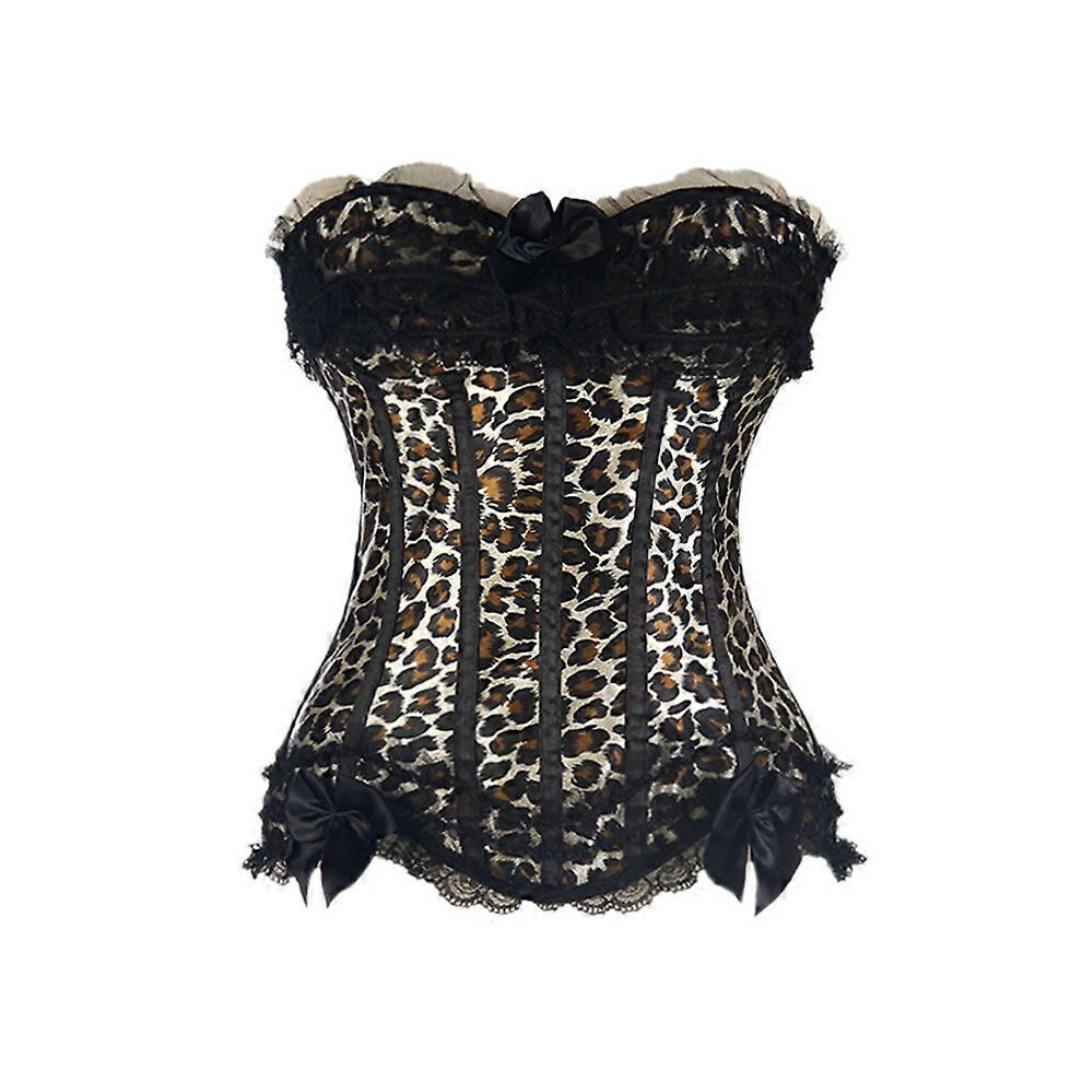 (S, Leopard print) Sexy Satin Lace Overlay Corset Bustier Overbust Burlesque Corselet Top Bodyshaper Lingerie Showgirl Party Costume Plus Size