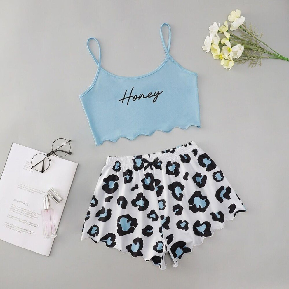 (M, blue) Women's Pajamas Set Sexy Lingerie Leopard Print Sling Sleepwear V-neck Sleeveless Top And Shorts Sets Pyjamas Homewear