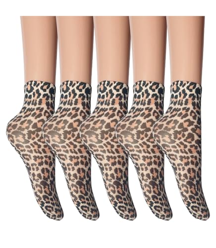 changyexi 5 Pairs Women's Sheer Leopard Print Ankle Socks, Fashion Cheetah Pattern, Leopard, One size