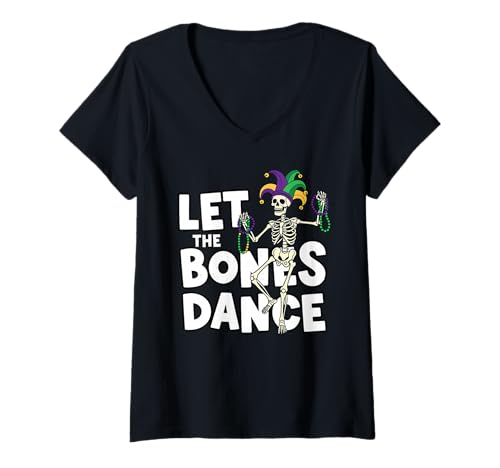 Women's Mardi Gras Dancing Skeleton Let The Bones Dance Funny Parade V-Neck T-Shirt