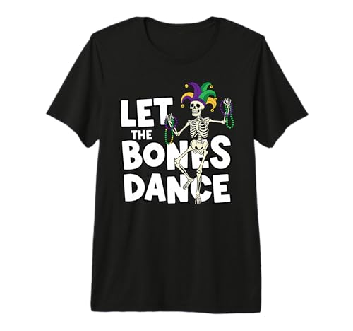 Mardi Gras Dancing Skeleton Let The Bones Dance Funny Parade Premium T-Shirt