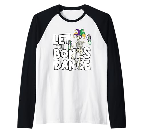 Mardi Gras Dancing Skeleton Let The Bones Dance Funny Parade Raglan Baseball Tee