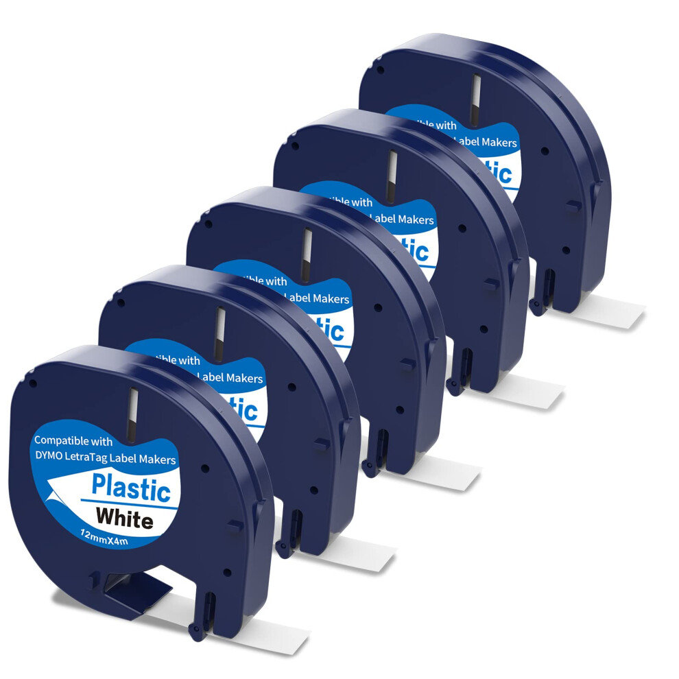 Replacement for DYMO LetraTag Refills 91331 White Plastic Label Tape 12mm x 4m(1/2" x 13ft) for Dymo LetraTag Label Maker Refills LT-100H LT-100T 200B QX50 (Black on White, 5 Pack)
