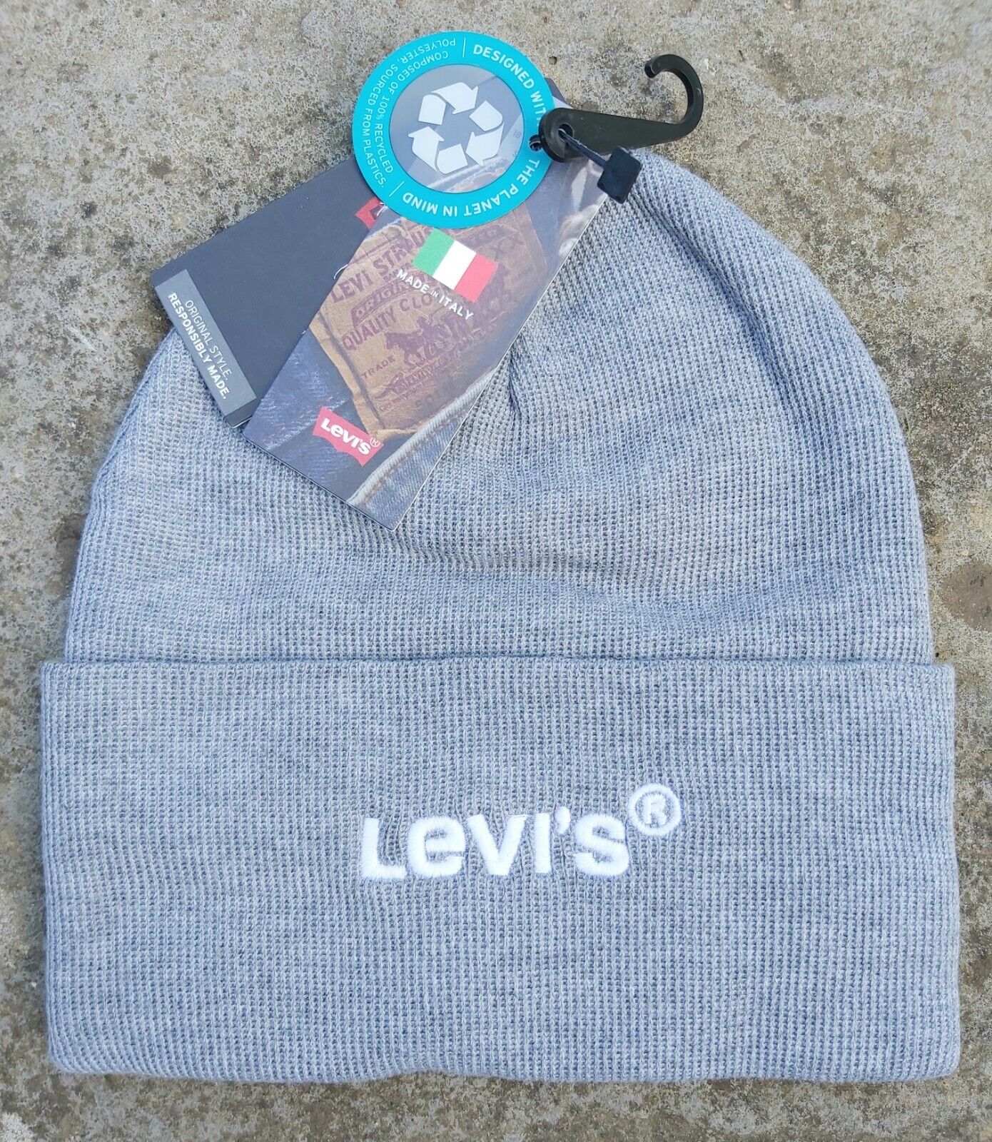 LEVI'S Grey Cuff BEANIE White LOGO Hat Toque UNISEX MADE IN ITALY