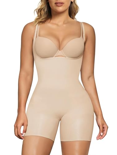 SHAPERX Women's Shaping Bodysuits Open Bust Tummy Control Body Shaper Mid-Thigh Bodysuit Shorts Seamless Shapewear, UK-SZ5258-2-Beige-L/XL