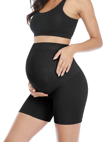 POSHGLAM Women's Maternity Shapewear Seamless Pregnancy Underwear Belly Support High Waist Mid-Thigh Panties Shorts, A01 Black, M