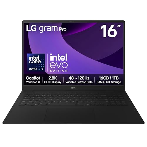 LG gram Pro 16Z90TP-K - 16 Inch 2.8K OLED 120Hz VRR, Ultra-Lightweight Laptop, Intel Core Ultra 7 255H - EVO Edition, 16GB RAM, 1TB SSD, Windows 11 Home, gram Hybrid AI, Copilot, Black (2025)