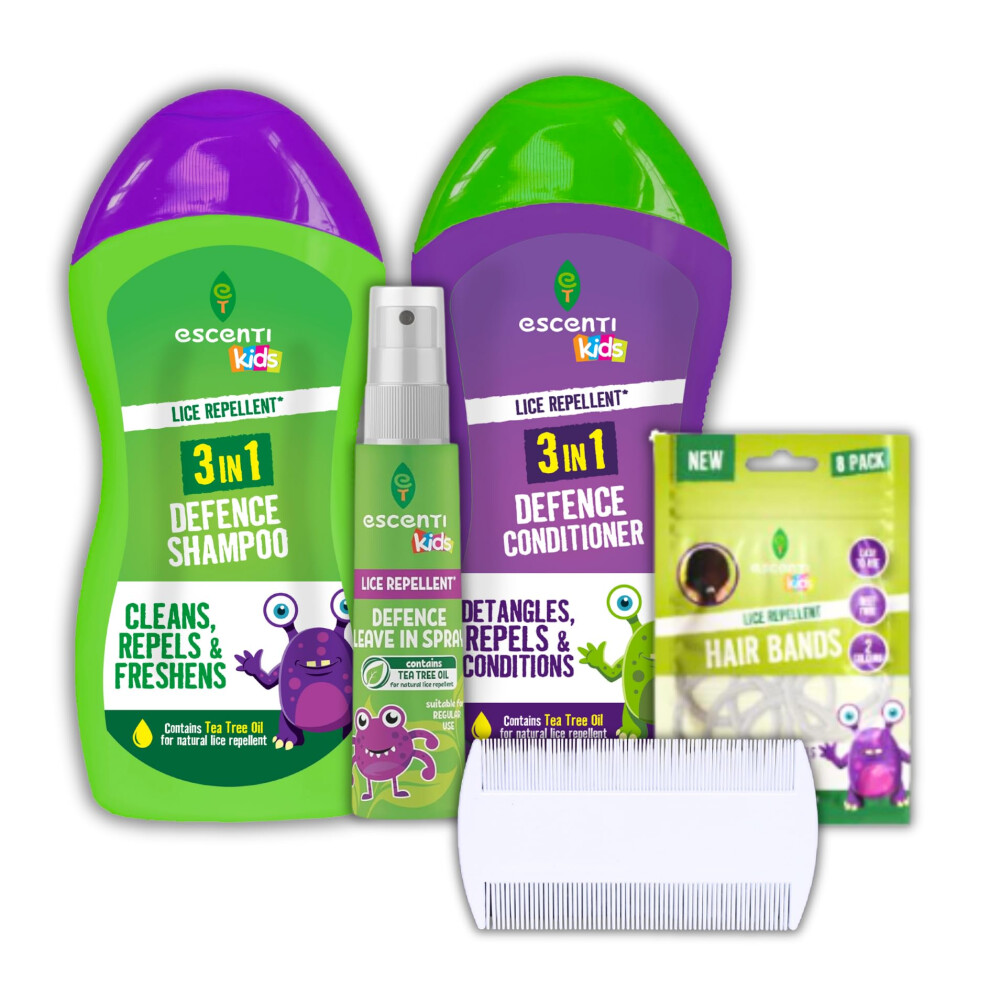 Escenti Kids Head Lice Prevention Bundle: Head Lice Shampoo, Tea Tree Conditioner, Leave-in Nit Repellent Spray for Kids with Tea Tree, Lice Bands 8pk