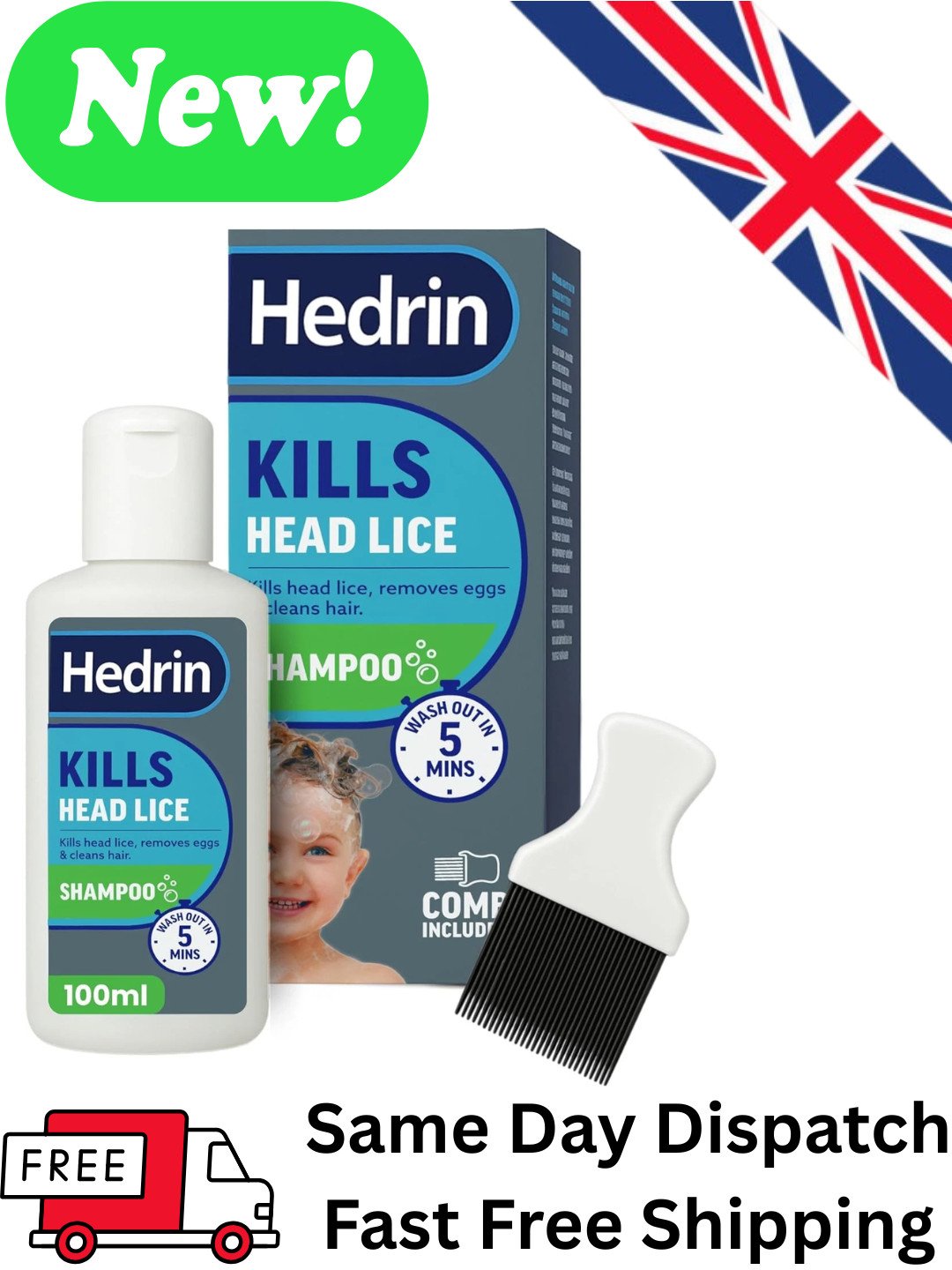 Hedrin Head Lice Shampoo & Comb Kit 100ml Kills Lice & Eggs in 5 Mins 4 Treatmen