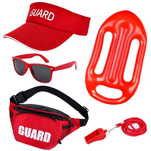 SelfTek 5 Pcs Lifeguard Costume Accessories, Red Lifeguard Hat Guard Whistle Waist Bag Black Sunglasses Inflatable Float Prop Life Guard Costume Fancy Dress for Women Men Beach Pool Halloween Party