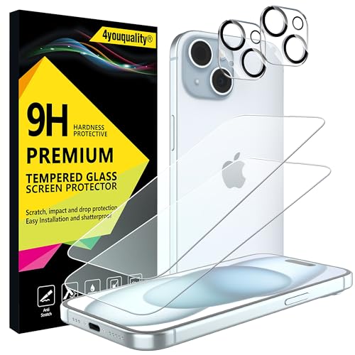 4youquality [4-in-1 Screen Protector for iPhone 15 with Camera Lens Protector, Tempered Glass Film, 2-Pack Each, [LifetimeSupport][Impact-Resistant][Anti-Scratch][Ultra-Transparent]