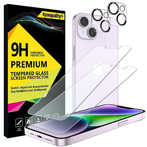 4youquality [4-in-1 Screen Protector for iPhone 14 with Camera Lens Protector, Tempered Glass Film, 2-Pack Each, [LifetimeSupport][Impact-Resistant][Anti-Scratch][Ultra-Transparent]