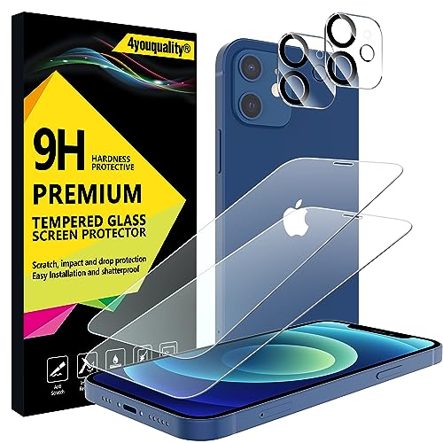 4youquality [4-in-1 Screen Protector for iPhone 12 with Camera Lens Protector, Tempered Glass Film, 2-Pack Each, [LifetimeSupport][Impact-Resistant][Anti-Scratch][Ultra-Transparent]