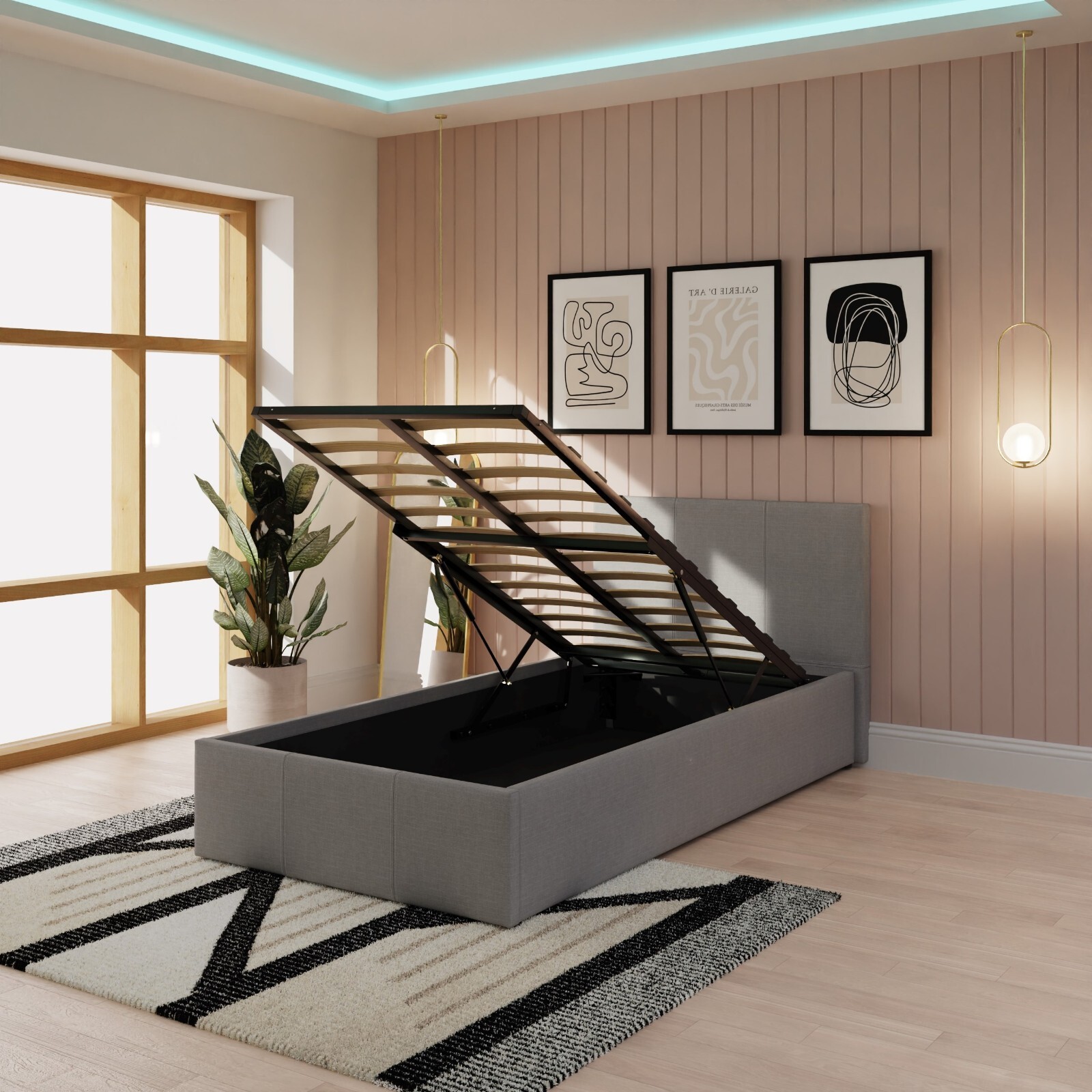 Single Ottoman Bed Grey End Gas Lift Up Storage Bed 3ft 90CM Single Fabric