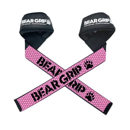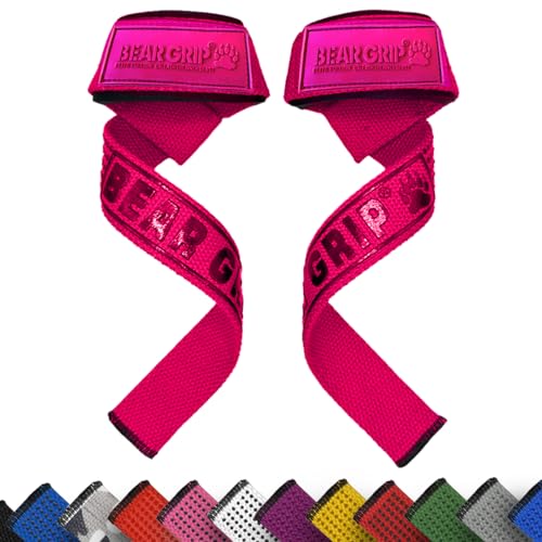 BEAR GRIP Straps - Premium Neoprene Padded Heavy Duty Double Stitched Weight Lifting Gym Straps, Deadlift, Gym Accessories for Men and Women, Advanced Gel Grip, 100% cotton, Extra long length (Pink)