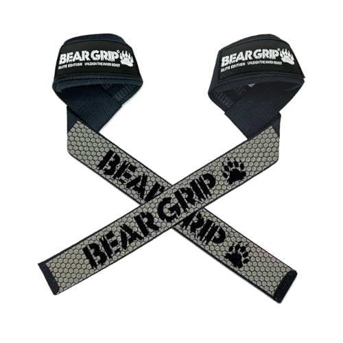 BEAR GRIP Straps - Premium Neoprene padded Heavy Duty double stitched weight lifting gym straps, Gel grip, 100% cotton, Extra long length (Grey)