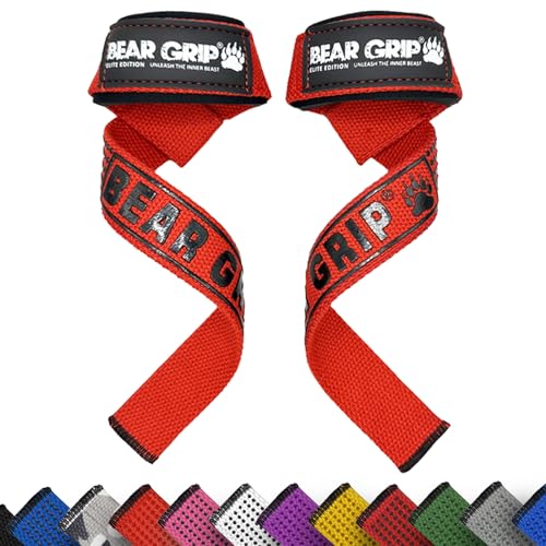 BEAR GRIP Straps - Premium Neoprene Padded Heavy Duty Double Stitched Weight Lifting Gym Straps, Deadlift, Gym Accessories for Men and Women, Gel Grip, 100% cotton, Extra long length (Red Elite)