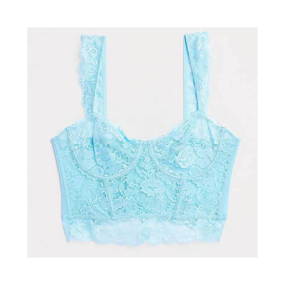 (Light blue, M) Wide-cut low-cut underwire mesh lace corset that can be worn outside fashionable summer sexy suspender tops