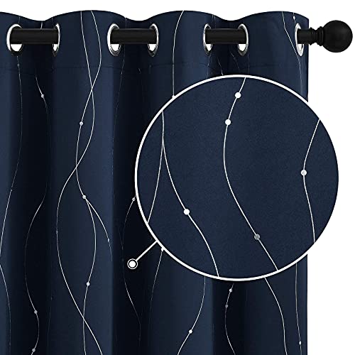 StangH Blackout Curtains Silver Wave Line and Dots Printed Thermal Insulated Window Drapes Grommet Light Blocking Drapery for Living Room Guest Room, Navy Blue, W52 x L72 inches, 2 Panels